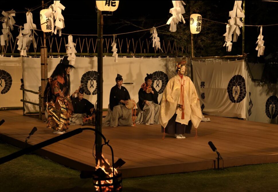 Au temple Kofukuji, le Takigi Noh a lieu le troisième vendredi et samedi de mai, avec le Noh (drame musical traditionnel japonais) et le Kyogen (comédie). Le monde du Nô, interprété à la lumière des bûchers ardents, est d’une beauté fantastique et mystérieuse.