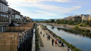 Qu’y a-t-il sur cette photo ? C’est noryoyuka, terrasse élevée sur le lit de la rivière Kamo. Vous pourrez y goûter des plats en entendant le bruissement de la rivière et en y prenant l’air. Sur la rivière, vous pourrez remarquer un fait : les couples s’y assoient en laissant un espace régulier avec leurs voisins. Je trouve que cette scène est représentative du caractère ordonné des Japonais, qui aiment l’alignement et l’harmonie.