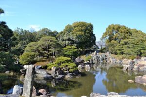 Après la visite du palais Ninomaru, vous irez ensuite à son jardin. L’îlot du bonheur éternel flanqué par deux îlots se trouve au milieu de l’étang. C’est ce jardin qu’on a apprécié depuis l’intérieur du palais dans le temps. Beaucoup de roches se dressent dans ce jardin, toutefois, vous pourrez y éprouver une impression d’étendue. Dans l’enceinte du château de Nijo, il y a aussi deux autres jardins construits à différentes époques. Il sera intéressant de trouver les différences.