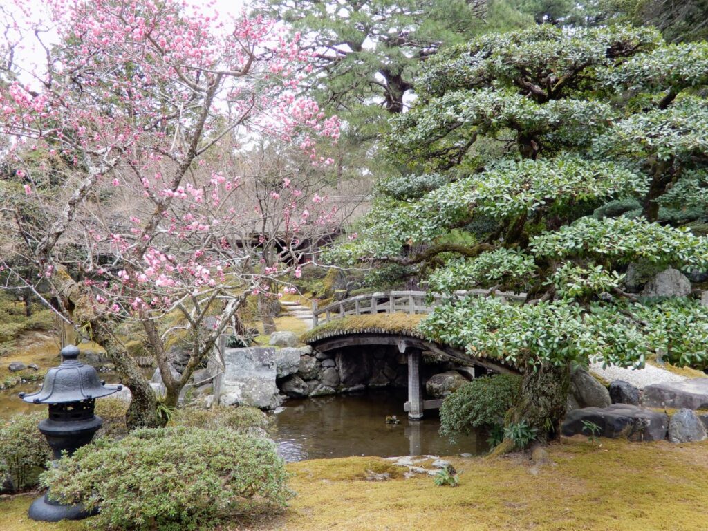 Cette cour avec une lanterne en pierre et de petits palmiers est entourée de trois pièces. Elle est légèrement sombre et appelée « jardin ombragé ».