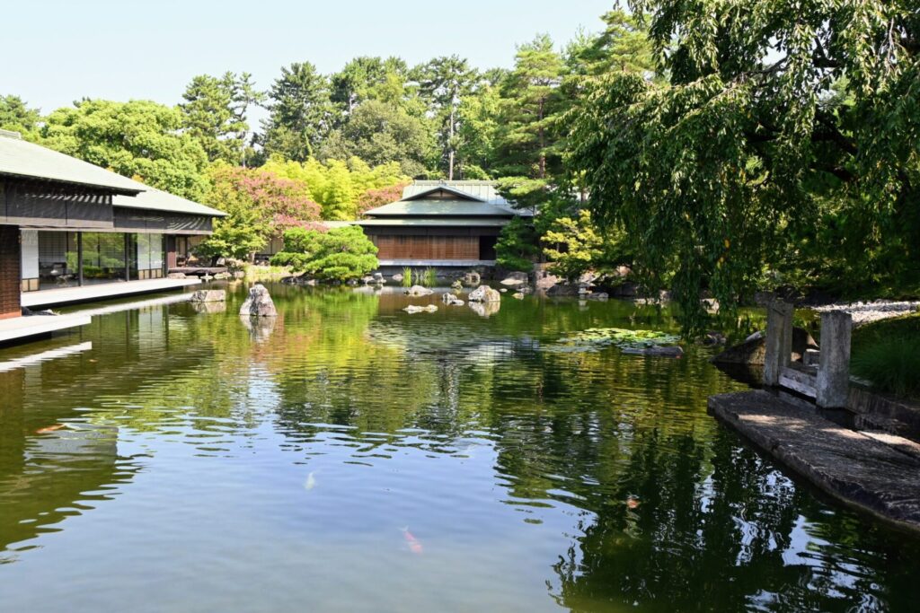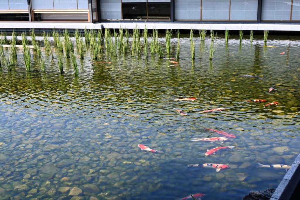 Dans le jardin, le vaste étang s’harmonise bien avec les bâtiments environnants. Les carpes d’ornement appelées nishikigoï qui nagent dans l’étang sont très belles, comme la peinture japonaise.