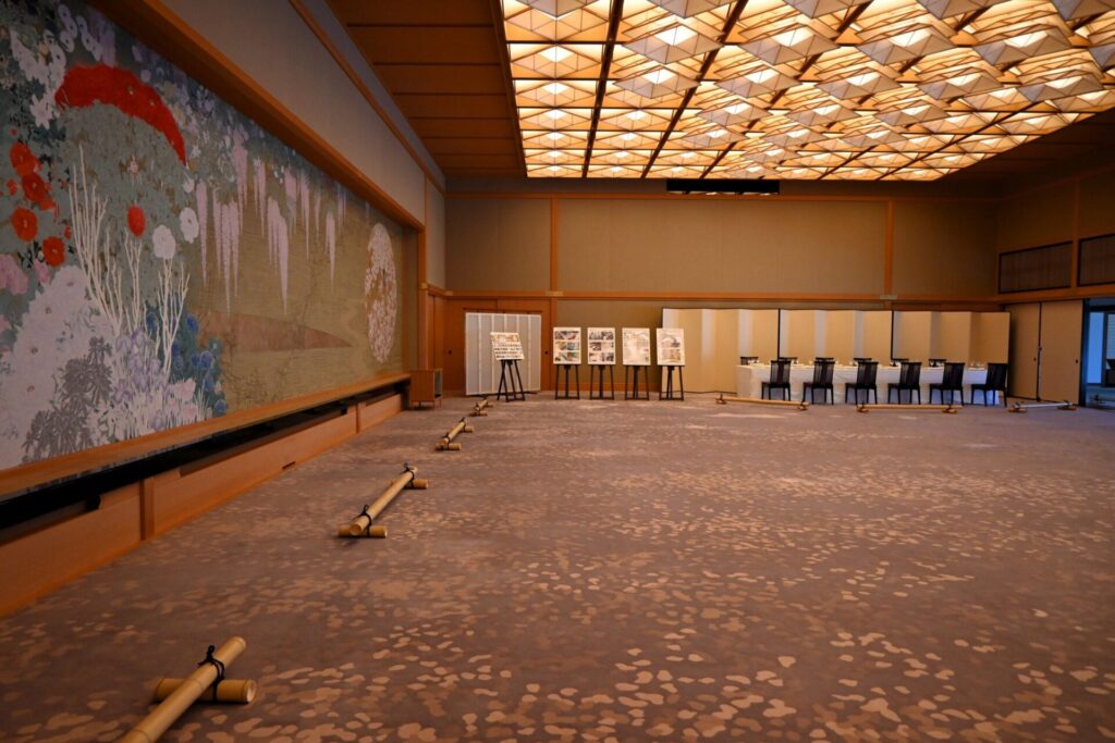 La salle de glycine pour le banquet de style occidental. Remarquez la tapisserie représentant 39 sortes de plantes ou encore le grand travail de menuiserie que représente l’éclairage au plafond.