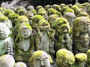 C’est un temple un peu singulier, mais intéressant à visiter. Même si vous vous intéressez aux statues du Bouddha, vous serez sans aucun doute surpris par ses 1 200 statues en pierre couvertes de mousse, rakan qui représentent les disciples de Bouddha. Puisque chaque statue a été sculptée par des amateurs, chaque visage est différent. Vous trouverez des statues humoristiques. Mais pourquoi l’enceinte de ce petit temple est-elle remplie de nombreuses statues comme ça ?