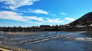 Son nom signifie littéralement le pont que la lune traverse. Il a été attribué à ce pont en raison d’un poème écrit par un empereur. Il se situe sur la rivière où la pêche aux cormorans est pratiquée en été. Le bruissement de l’eau est agréable pour les oreilles. La montagne Arashiyama se dresse au-delà de ce pont. Dans le parc des singes qui se situe sur le flanc de la montagne, environ 130 singes sauvages vivent. Vous pourrez en observer de tout près.