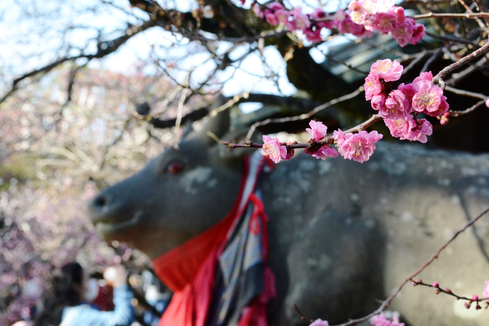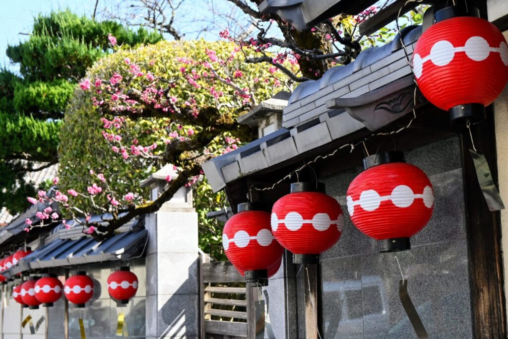 Kitano Tenman-gu est célèbre pour les fleurs de prunier. Le prunier a été un arbre favori de Michizane. Avant de quitter Kyoto, il a laissé un poème court pour dire adieu au prunier planté dans son jardin : « Quand la brise printanière souffle, vous vous laissez porter par la brise et me livrez votre senteur fraîche. Ma chère fleur de prunier, n’oubliez pas le printemps même si votre maître n’est pas avec vous. » Vous y trouverez des statues de vache. Selon le zodiaque chinois, Michizane est né dans l’année de la vache. Cet animal y est considéré comme messager divin. Caressez la tête de vache pour l’intelligence. Les vaches y ont une pose assise en référence à une légende selon laquelle la vache qui traînait un char pour transporter les dépouilles de Michizane s’est figée soudainement. Mais la seule vache qui se tient debout se cache dans le bâtiment principal. Pourrez-vous la trouver ?