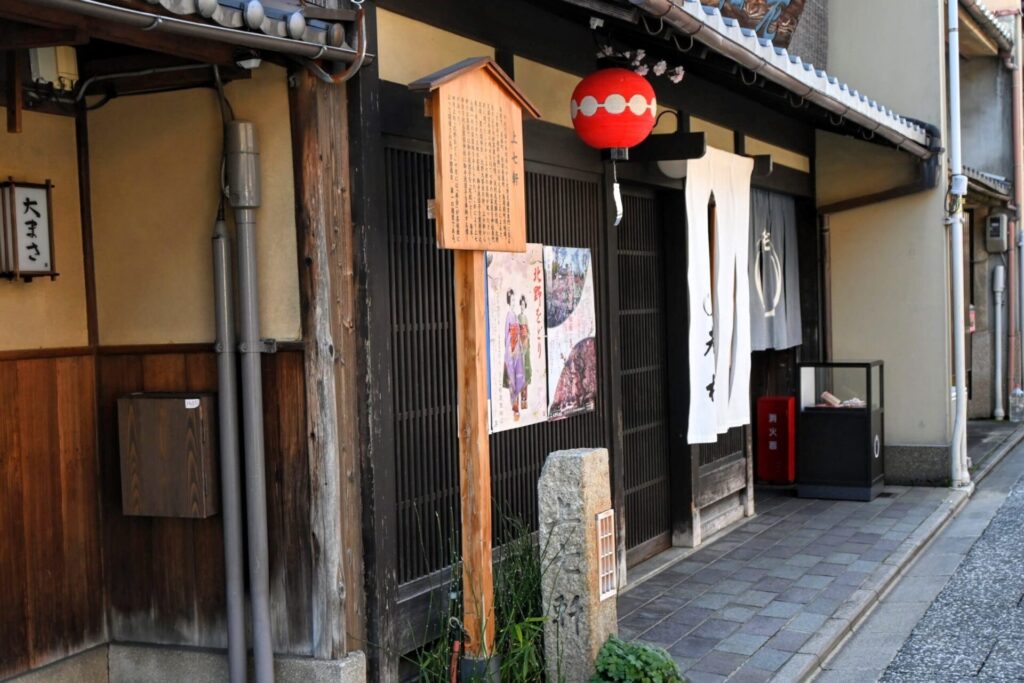 Situé à l’est du sanctuaire shinto Kitano Tenman-gu, il est le plus ancien quartier réservé aux geishas à Kyoto. Le nom Kamishichiken vient des sept maisons de thé construites à partir des morceaux du sanctuaire shinto Kitano Tenman-gu lors de sa reconstruction qui a eu lieu au XVème siècle. Le motif représentant les boulettes de pâte de riz gluant appelées dango est dessiné sur les lampions. Il y a de nombreux bâtiments traditionnels en bois. Certains d’entre eux servent de salles de banquet pour le spectacle, ochaya ou de logements de maiko, okiya. Que diriez-vous de flâner dans ce quartier qui dégage une ambiance paisible et raffinée ?