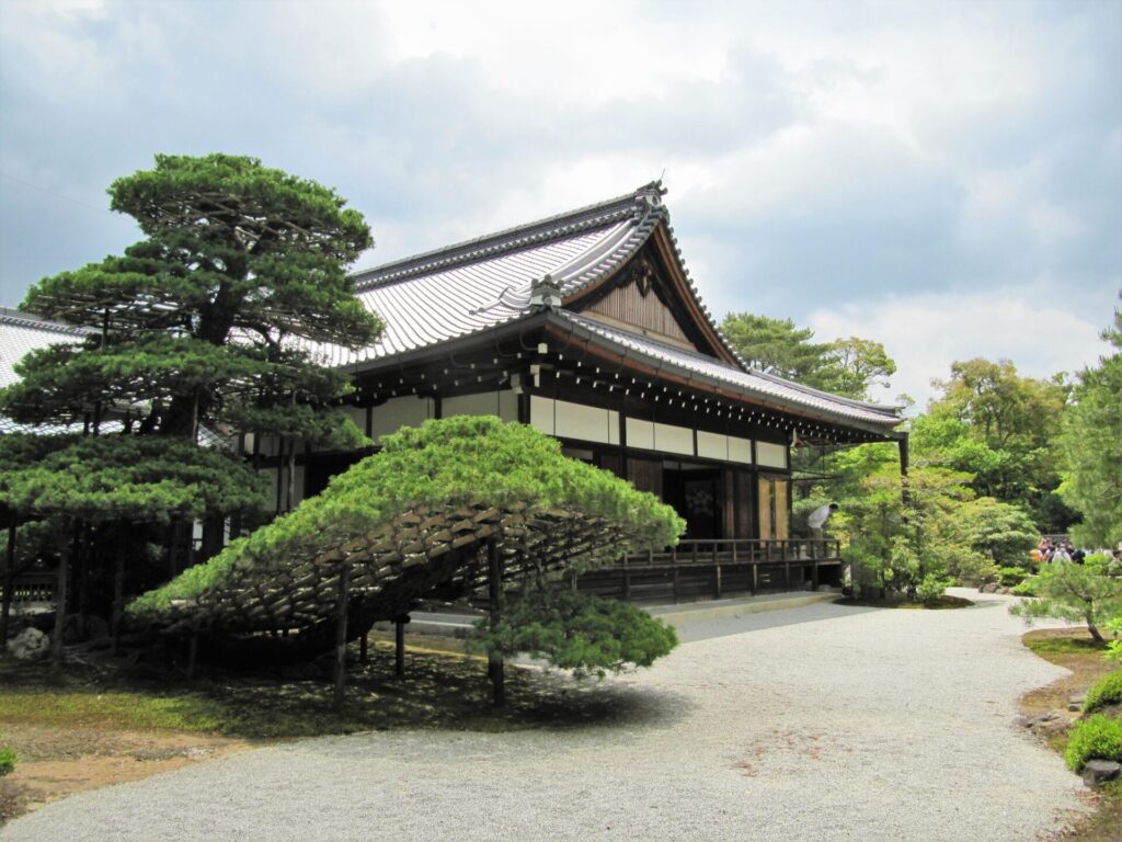Un grand pin ancien se voit dans le jardin. Planté par le shogun, il a plus de 600 ans. Quelle forme vous paraît-il avoir ?