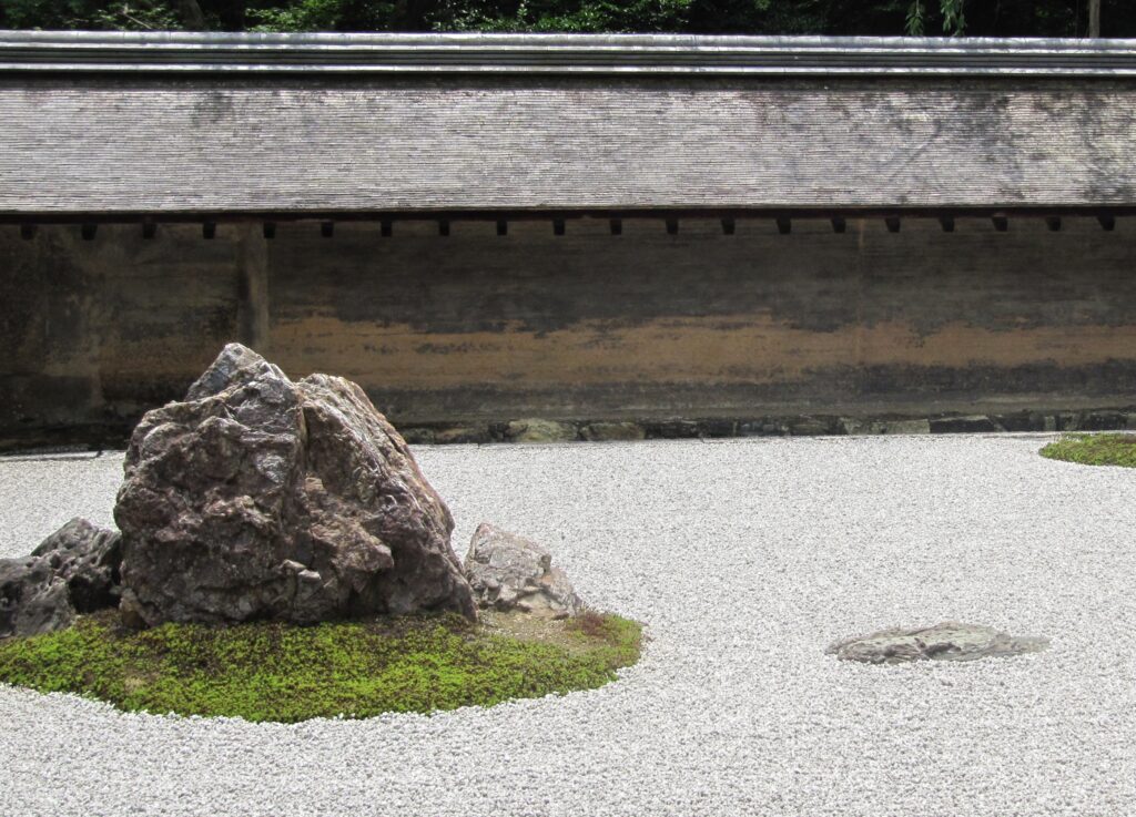 Le temple Ryoan-ji est un temple zen. Ce qui est à voir dans ce temple, c’est son jardin de pierres. Il se compose simplement de sable blanc ratissé et 15 pierres couvertes de mousse.