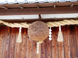 Savez-vous ce que c’est ? C’est une boule d’aiguilles de cèdre que les propriétaires de brasserie mettent au-dessus de l’entrée pour annoncer un nouveau tirage de saké . Au début, cette boule est verte, mais graduellement elle devient fanée et brune. Cela annonce le degré de fermentation du saké nouveau. On peut donc reconnaître le fabricant de saké à cette boule d’aiguilles de cèdre.