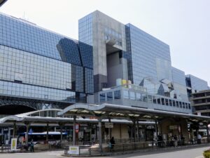 La gare de Kyoto desservie par le shinkansen, les lignes des compagnies ferroviaires JR et Kintetsu, et le métro est la porte d’accès à la ville. Vous serez étonné de son style très moderne, qui contraste avec l’ambiance traditionnelle de la ville. La gare actuelle reconstruite en 1997 fait aussi fonction de centre commercial. Il y a aussi un grand hôtel et un théâtre. À quelque pas de la sortie nord Karasuma-guchi se dresse un bâtiment emblématique de la ville, la Tour de Kyoto.