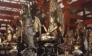 À côté du Kon-do se trouve le Ko-do, le bâtiment réservé aux enseignements de l’ésotérisme. Réparties par groupes de divinités bouddhiques (Nyorai, Bodhisattva, Myo-o et Tenbu), 21 statues de Bouddha y sont installées. Que représentent-elles ? Dans le bouddhisme ésotérique japonais, le dainichi nyorai, le Bouddha grand soleil se trouve au centre de l’univers et est censé abriter tous les êtres de l’univers. C’est-à-dire que tous les phénomènes émanent de ce Bouddha primordial. Selon les cas, le Bouddha dainichi nyorai se métamorphose en d’autres divinités bouddhiques pour porter secours aux humains. Par exemple, il guide les gens sous la forme d’un Bodhisattva avec une expression miséricordieuse. S’ils sont désobéissants, il les attrape et mène au droit chemin sous la forme d’un Myo-o avec une expression effrayante. Le mandala, l’image réduite du bouddhisme ésotérique représente le monde où le Bouddha dainichi nyorai sauve les humains avec sa sagesse et sa miséricorde. Pour aider les gens à mieux comprendre la quintessence du bouddhisme ésotérique, Kukai a conçu un mandala à trois dimensions composé de ces 21 statues de Bouddha, avec le dainichi nyorai au centre. Vous serez impressionné par son ambiance majestueuse.