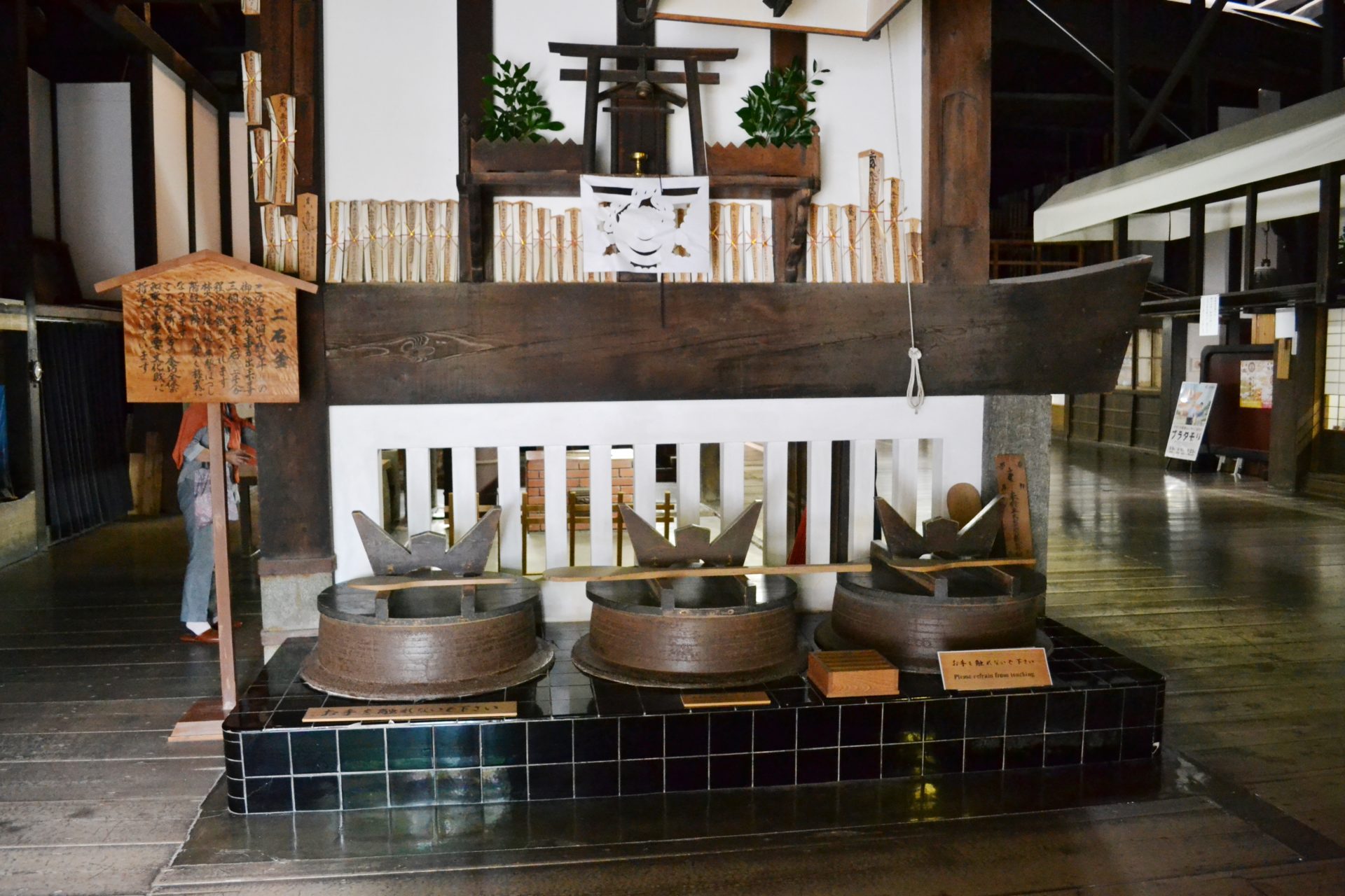 Qu’est-ce qu’on voit sur le toit couvert d’écorces de cyprès japonais de ce bâtiment principal ? Ce sont des barils pour recueillir l’eau de pluie, mais pour quelle raison ?