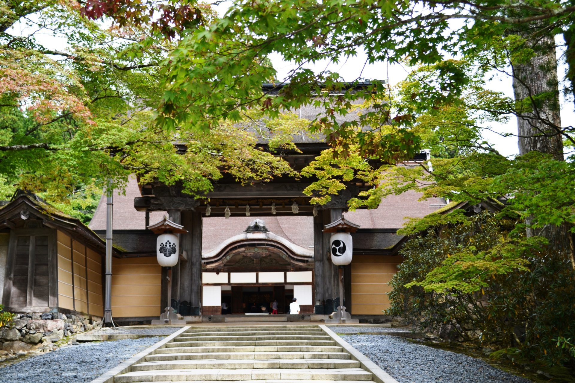 Situé près de Danjo Garan, le temple Kongobu-ji fait office de temple principal du mont Koya. Si vous n’avez pas assez de temps de visite au mont Koya, je vous conseille de le visiter. Il a deux blasons. Vous pourrez les confirmer aux lanternes de porte. Le blason de gauche est à motif de paulownia et celui de droite est à motif d’ornement antique appelé magatama.