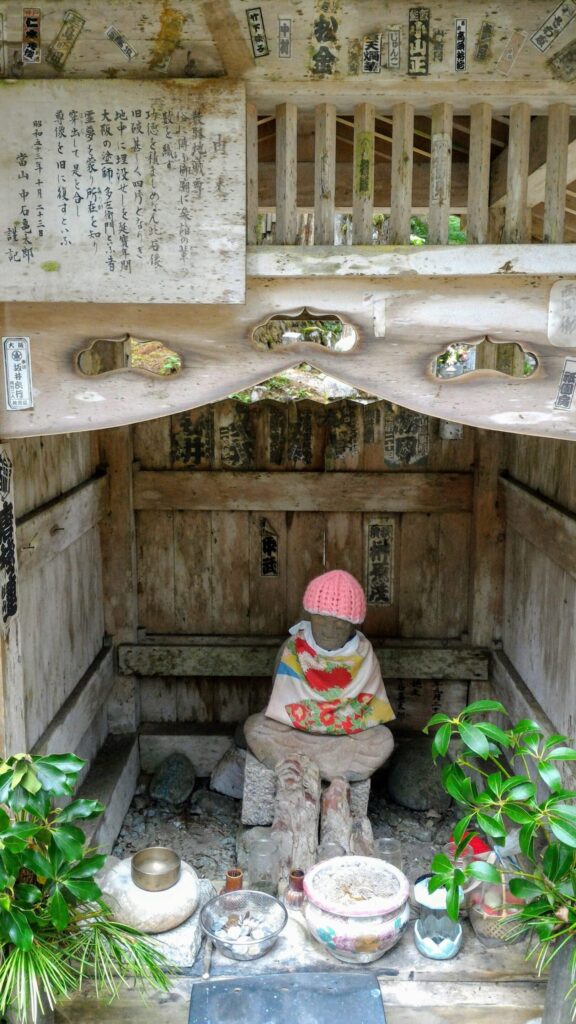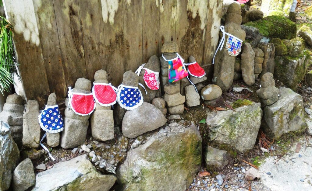 Vous y remarquerez aussi de petites statues de pierre portant des bavoirs ou des bonnets. Ce sont des statues du bodhisattva jizo. Comme le jizo nous est le bouddha le plus familier, il est vénéré non seulement dans les temples mais aussi au coin de la rue. Dans le bouddhisme, le jizo travaille en souhaitant secourir les hommes contre la souffrance et le malheur. Selon la croyance populaire, le jizo veille sur les enfants et protège les âmes des enfants décédés dans l’au-delà. C’est pourquoi il garde les traits du visage d’enfant. Je vais vous montrer les jizo intéressants à voir en s’y baladant.