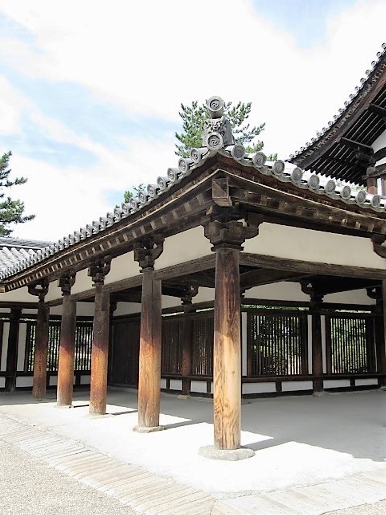 Au-delà de la première et deuxième porte, les deux bâtiments les plus anciens de ce temple trônent côte à côte au milieu de la cour centrale. Leur histoire remonte aux dernières années du VIIème siècle. Le bâtiment de gauche en bois est Kon-do, un bâtiment imposant pour vénérer la principale statue de Bouddha. Vous pourrez y contempler les statues du Bouddha du VIIème siècle qui traduisent l’influence chinoise et d’autres à travers le treillis métallique. Son espace obscur souligne davantage l’atmosphère mystérieuse de ces chefs-d’œuvre. Le bâtiment de droite est la pagode à cinq étages en bois pour vénérer les reliques du Bouddha. Les statues d’argile renfermées dans tous les côtés de sa base qui décrivent la vie du Bouddha sont remarquables.