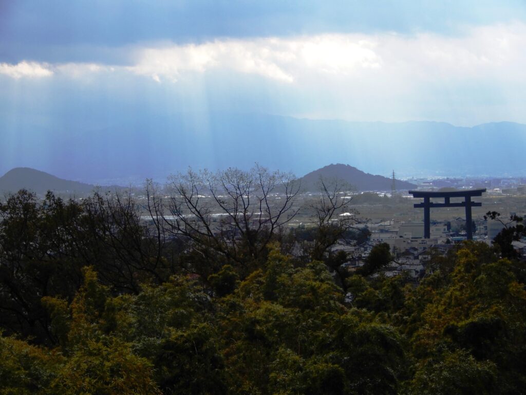 Depuis la plateforme d’observation, vous aurez une belle vue sur le grand portique du sanctuaire shinto Oomiwa-jinja et la chaîne de montagnes. Sur votre gauche, il y a trois petites montagnes, le mont Miminashi, le mont Unebi et le mont Kagu. Ces montagnes ont été prises plusieurs fois comme thème dans la première anthologie de poésie japonaise, manyoshu.