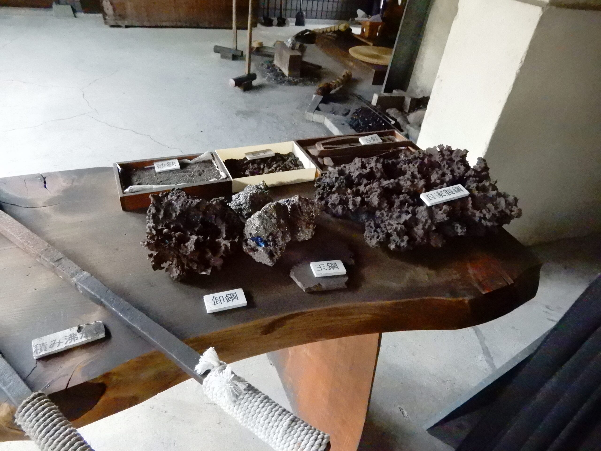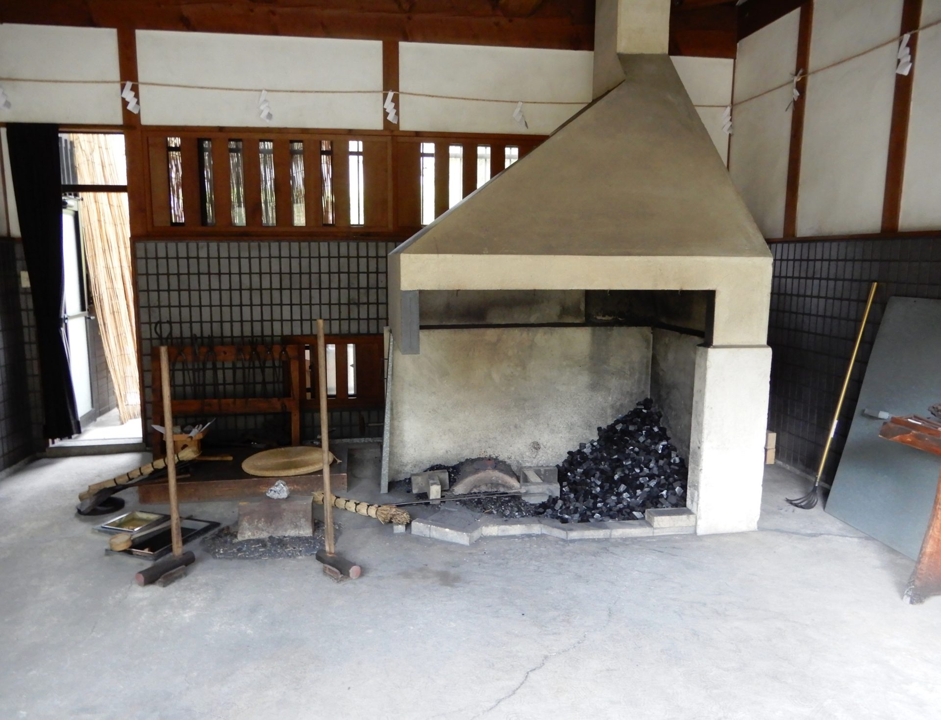 La forge est à côté du musée. On ne peut pas y voir la fabrication des lames, mais l’acier tamahagane, les outils utilisés et le procédé de fabrication y sont montrés au public.