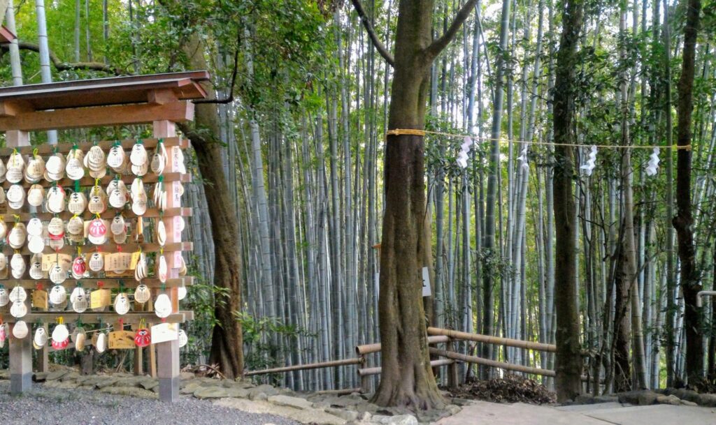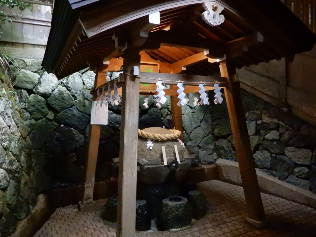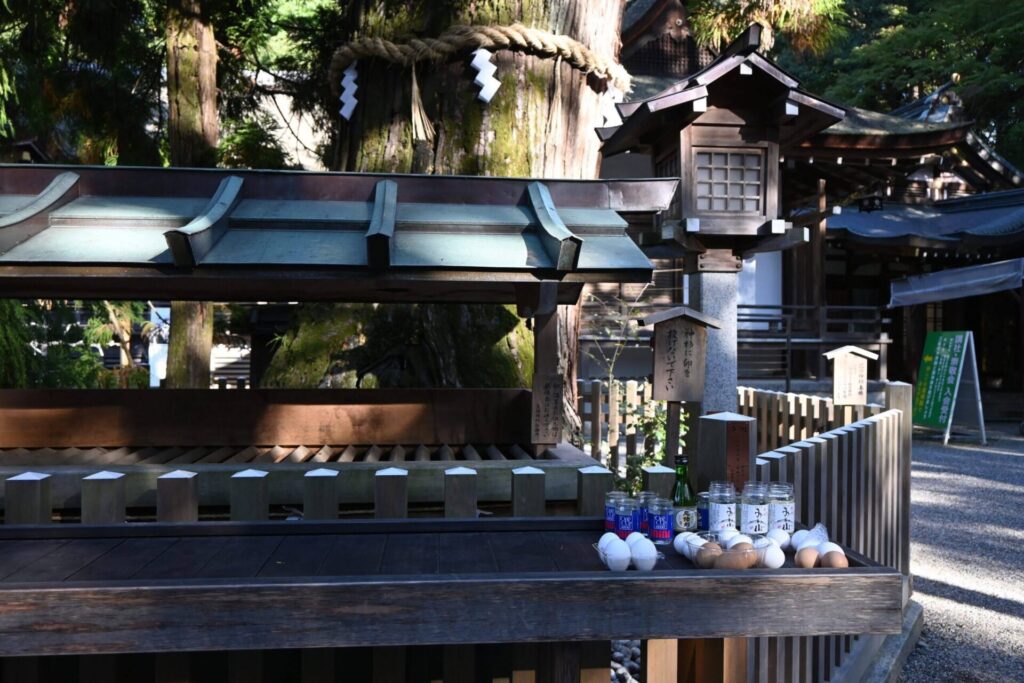 Selon la mythologie japonaise, le dieu de ce sanctuaire Oomononushi a contribué à la fondation du pays. Il est aussi vénéré comme dieu de médicament et de fabrication du saké, alcool de riz. Les propriétaires de brasserie de saké mettent au-dessus de l’entrée une boule d’aiguilles de cèdre pour annoncer un nouveau tirage de saké. Cette boule appelée sugidama est faite avec les aiguilles de cèdre du mont sacré Miwa. Le dieu Oomononushi apparaît sous la forme d’un serpent dans des mythes japonais. Un serpent qui se love vous accueille au pavillon d’ablution. L’eau coule de la gueule du serpent. Je le trouve intéressant. En caractère chinois qu’on utilise au Japon, le robinet s’écrit 蛇口. Le premier caractère 蛇signifie serpent et le deuxième 口signifie bouche ou gueule en français. Le robinet y est représenté littéralement par la gueule du serpent. Vous trouverez aussi des œufs, nourriture préférée des serpents dans l’enceinte du sanctuaire. Des œufs sont donc des offrandes.
