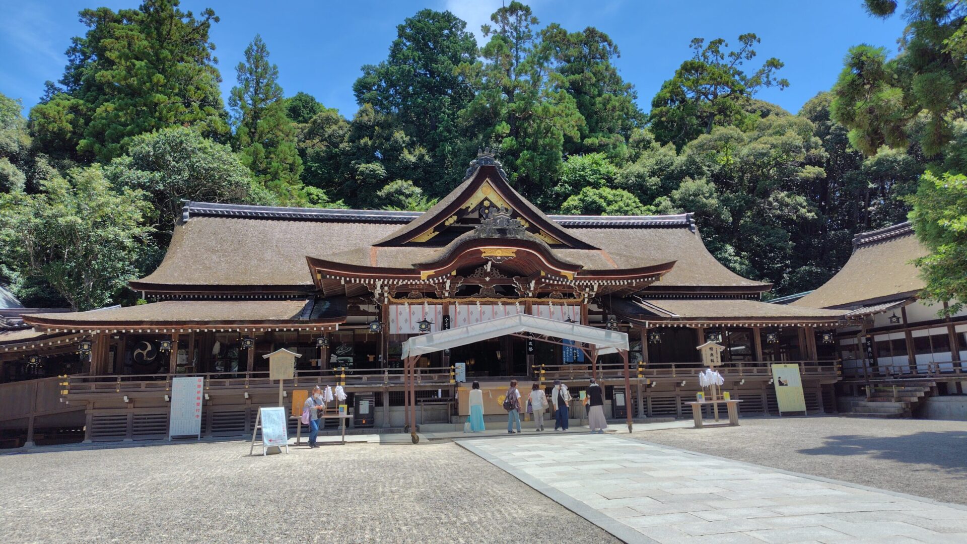 Dans un sanctuaire shinto, il y a le bâtiment le plus sacré du sanctuaire, honden où est vénéré le go-shintai, l’objet de culte dans lequel l’esprit de la divinité shinto demeure. On fait la prière en direction du honden depuis le bâtiment du culte, haiden placé en face du honden. Mais le sanctuaire shinto Oomiwa-jinja n’a pas de honden. Pourquoi ? C’est parce que le mont Miwa situé derrière ce sanctuaire est considéré comme go-shintai, l’objet de culte. Autrement dit, le mont Miwa tout entier est vénéré comme montagne sacrée où le dieu de ce sanctuaire habite. Ce style témoigne du shintoïsme originel. On dit qu’il est un des plus vieux sanctuaires shinto du Japon. Les trois portiques, mitsu-torii se trouve entre le mont sacré Miwa et le haiden.