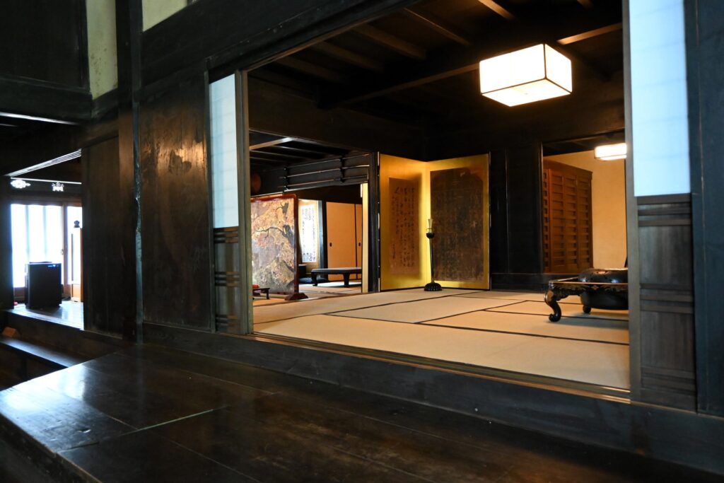 Voici la demeure de la famille Imanishi datant de 1650. Cette famille servait de chef d’administration du quartier d’Imai. Ses murs extérieurs sont complètement recouverts de plâtre. Certes, son entrée du nord a une apparence de maison traditionnelle de commerçant, mais l’apparence de son côté ouest muni de tuiles majestueuses a l’air d’un château. À l’intérieur, il y a un sol spacieux de terre battue appelé doma. À quoi cet espace a-t-il servi ?