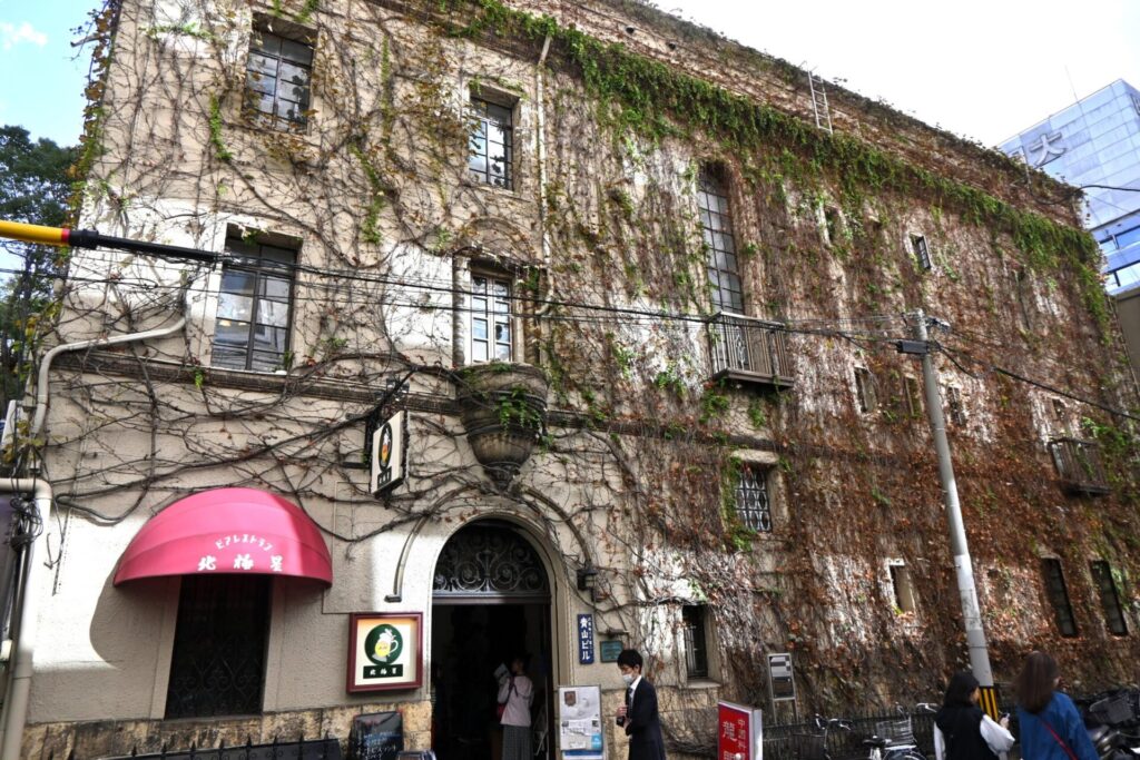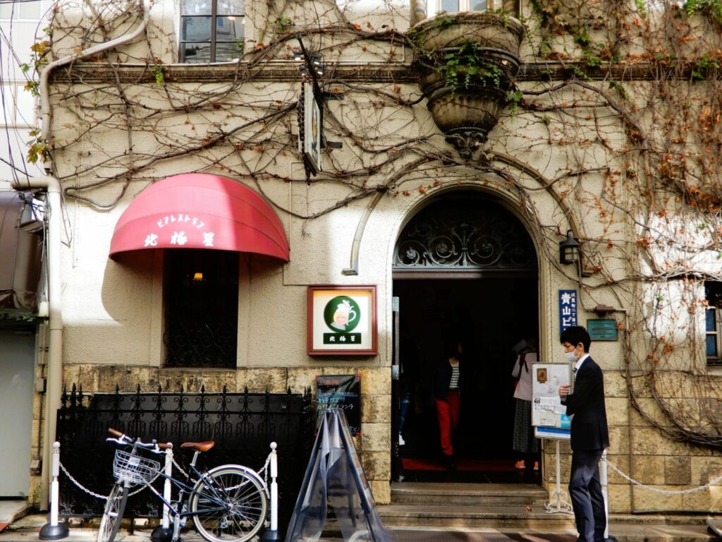 Aoyama Building dont le mur extérieur est recouvert de lierres a été construit en 1921 en tant que résidence privée. On y voit encore ici et là des éléments, comme les vitraux datant de ses origines.