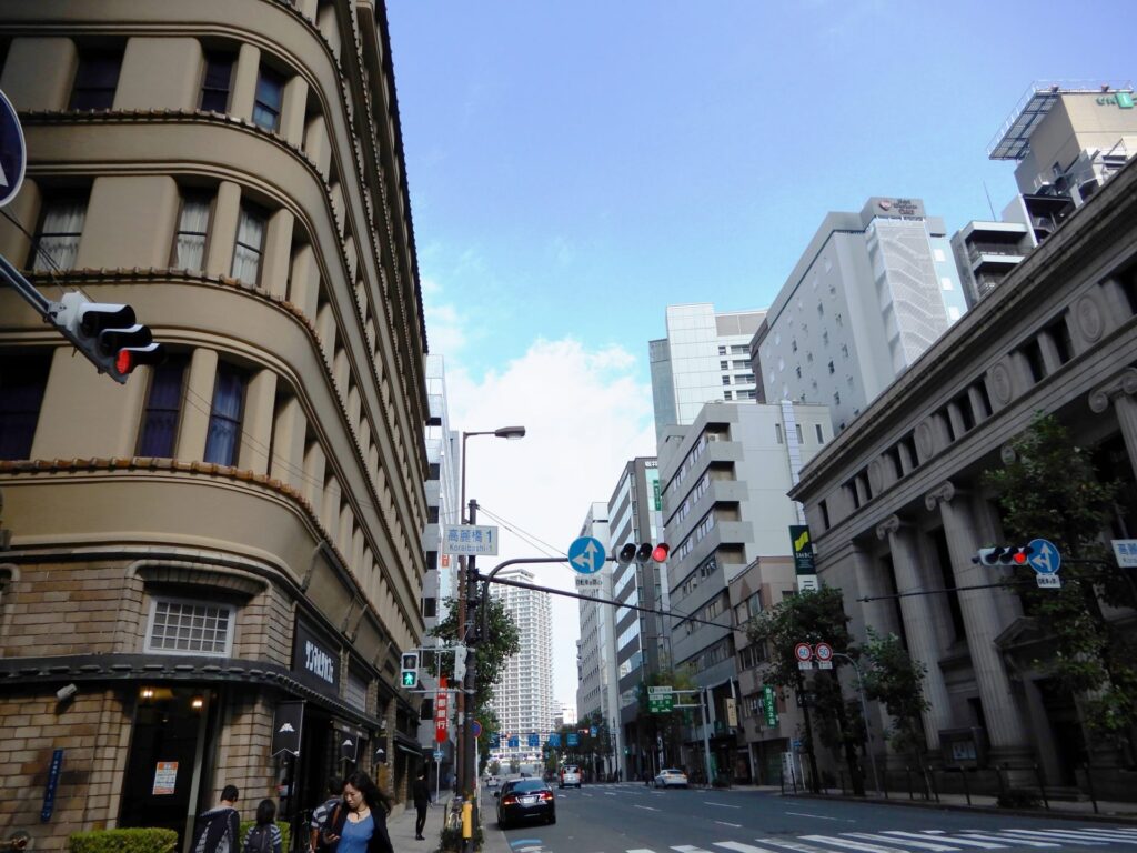 Situé au sud de Nakanoshima, Semba est une zone commerciale qui s’étend sur 2 kilomètres du nord au sud et sur 1 kilomètres d’est en ouest. Il n’y a pas de ville ou de station qui s’appelle « Semba ». Autrefois, ce quartier était entouré de rivières de tous les côtés et il y avait des embarcadères autour. D’où vient sans doute le nom « Semba ». Le quartier de Semba a été aménagé à l’ouest du château d’Osaka à la fin du XVIème siècle. Les commerçants qui sont venus s’y installer sont à l’origine de la prospérité des affaires d’Osaka. Avec l’expansion économique des années 1920 au début des années 1930, Osaka est devenue une des plus grandes métropole d’Asie. Beaucoup de bâtiments empreints de l’atmosphère occidentale ont été construits à cette époque dans le quartier de Semba. Nichés parmi les immeubles, ils sont encore vivants et utilisés comme bureaux, restaurants, boutiques, etc. Je décris quelques bâtiments représentatifs de la zone nord de Semba, Kita-Semba.